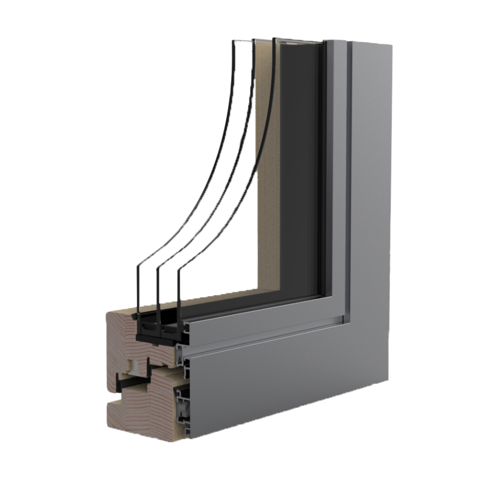 Holz-Aluminium-Fenster mit verstärkten Profilen für verbesserte Wärmedämmung und akustischen Komfort. Außen langlebiges Aluminium, innen Holz. Farblich variabel für genaue architektonische Abstimmung nach Normen.
