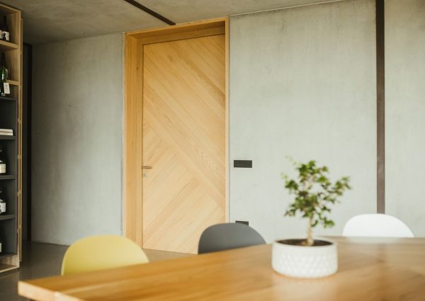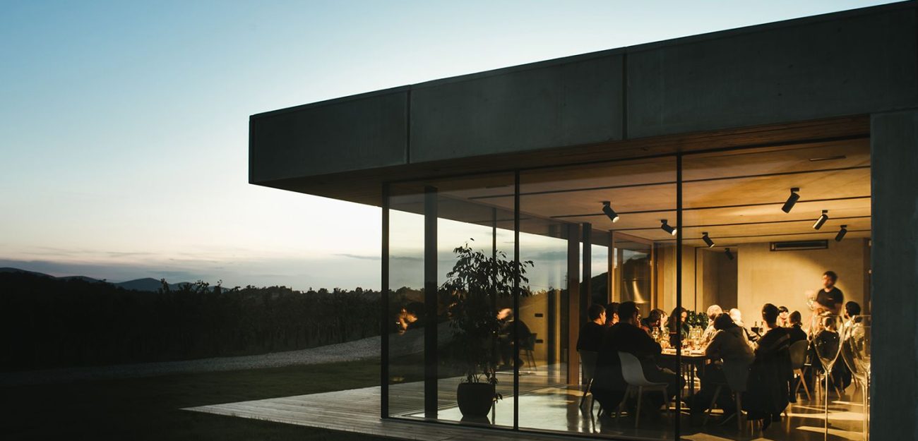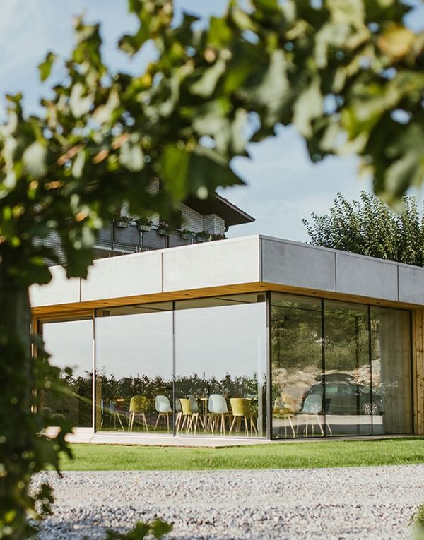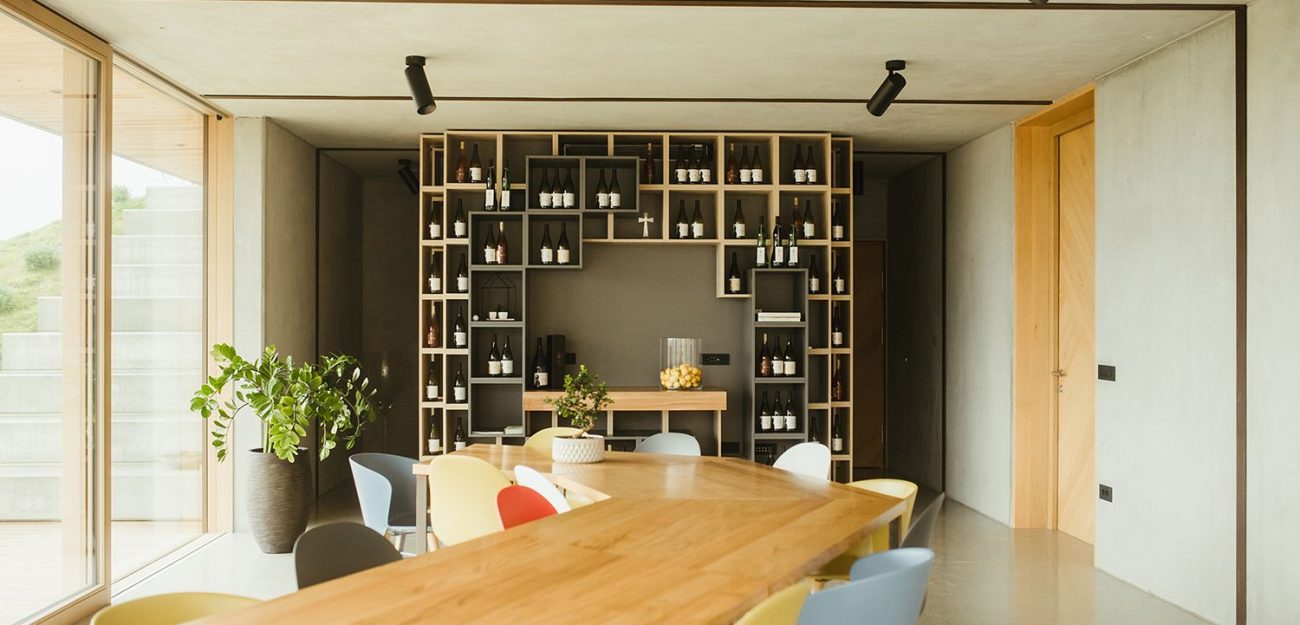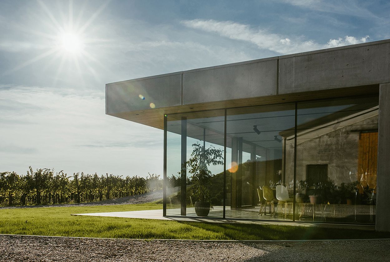 Die Aufgabe der Architekten ist es, einen getrennten Raum für die Degustation zu entwerfen, wo die jungen Winzer aus Vipava den Gästen eine authentische Präsentation bieten können. Neben Wein und Kulinarik eröffnet sich im neu gestalteten Raum auch ein schöner Blick ins Tal, der das Besuchserlebnis vollumfänglich macht. Das Objekt hat eine rechteckige Form mit klaren Linien. Durch die große Glaswand im Eck sowie durch die überdachte Terrasse gelangt man schnell vom inneren ins äußere Ambiente. Die gläserne Umrandung umgibt die Betonkonstruktion, Wärme und ein Gefühl des Zuhause-Seins vermittelt die Holzbeschichtung im Inneren des Objekts. (Foto: Nejc Bole)