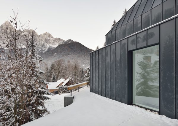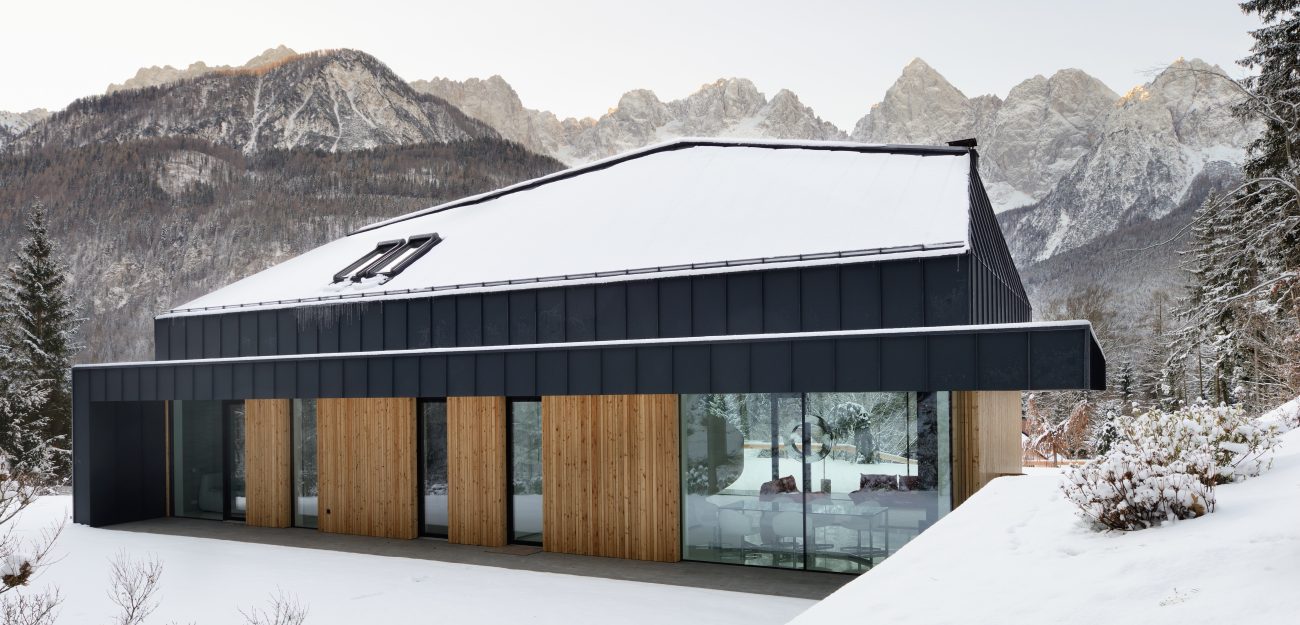 Ferienhaus am Waldrand, für das sich die Besitzer wünschen, dass man in allen Jahreszeiten darin den Puls der natürlichen Umgebung spüren kann. Das konnte mit großen Glasoberflächen erreicht werden.
