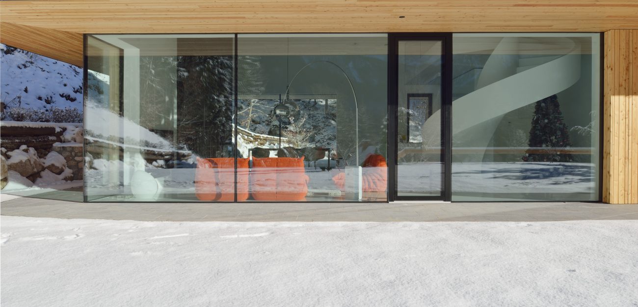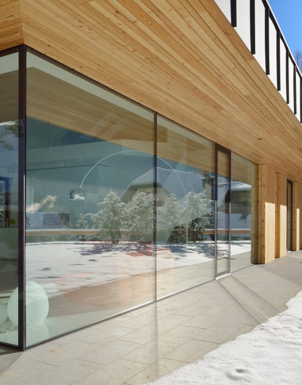 Fenster mit Glasaußenfläche: Holz hinter Isolierglas mit emailliertem Rand. Minimalistische Fassadengestaltung, geprüfte Dichtheit und Stabilität bei großformatigen Fenstern.
