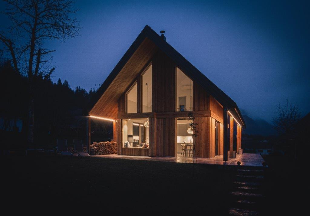 In der Kosteljska bedeutet „Bale, bale“ „Komm, komm“. Das Häuschen lädt schon mit seinem Namen zum Komfort der Natur ein, von dem es umgeben ist. Es wurde modern gebaut, jedoch mit Berücksichtigung des lokalen kulturellen und architektonischen Erbes. Die Bedachung ist eine dreischichtige Bedachung aus Lärchenholz, die Fassade ist mit vertikalen Leisten aus Lärchenholz durchlüftet. Das Objekt schwebt über einem steinernen Sockel aus Marmor aus Hotavlje. Der zentrale offene Raum ist 7,5 m hoch und bietet einen wunderschönen Blick auf die Kuželjska stena. Das Hauptelement des zentralen Raums ist ein schwarzer Kamin. Im Inneren des Hauses wurde als Grundmaterial massives Eichenholz verwendet. Der Esstisch die Stühle und der kleine Klubtisch zeigen die genaue Verarbeitung der Tischlermeister mit Betonung der Beständigkeit und Mächtigkeit der Eiche Das Haus befindet sich in der Kočevje. (Foto: Nik Grmovšek)