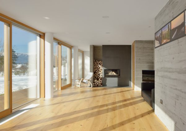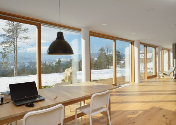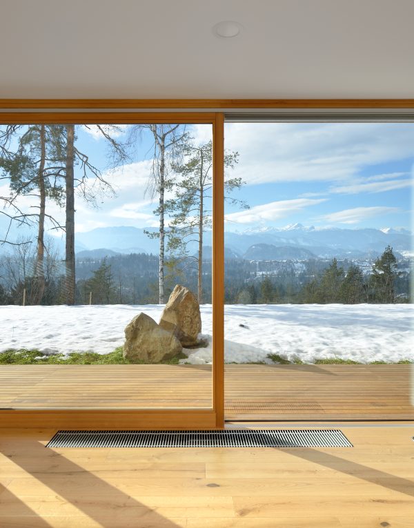Das Haus L steht am Rande der Siedlung, wo es auf der einen Seite einen wunderschönen Ausblick auf die Julischen Alpen und auf Bled bietet. Das Objekt ist mit den Fenstern und Panoramawänden auf den Wald bzw. auf das Bergpanorama im Hintergrund ausgerichtet, zur Straße hin verschließt es sich und schützt die Bewohner vor Lärm. Beim Design des Interieurs wurde durchdacht Beton, Glas und Holz kombiniert, um so einen offenen Raum zu erhalten, in dem das Gefühl des Zuhause-Seins vermittelt wird. (Foto: Miran Kambič)
