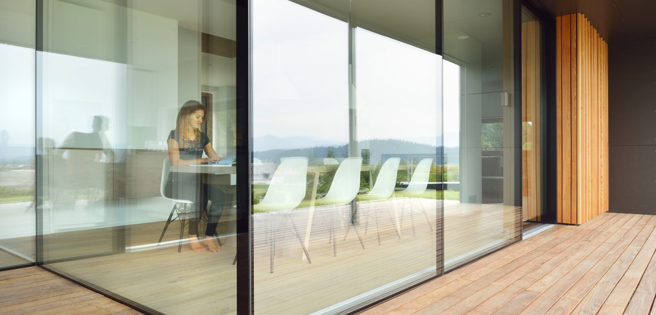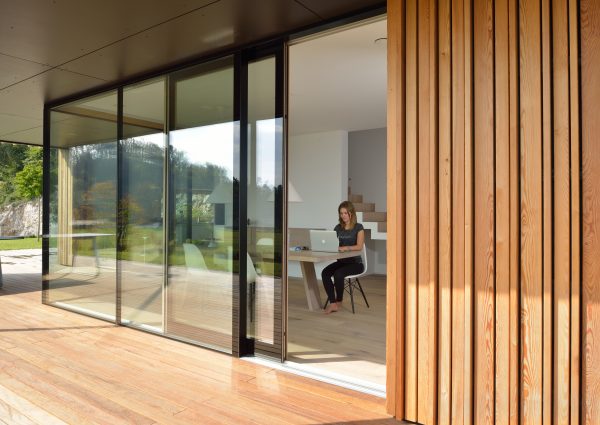 Das obere Plateau bilden die Privaträume rund um das Haus, die durch viele große Glasoberflächen mit den Wohnräumen verbunden sind.
