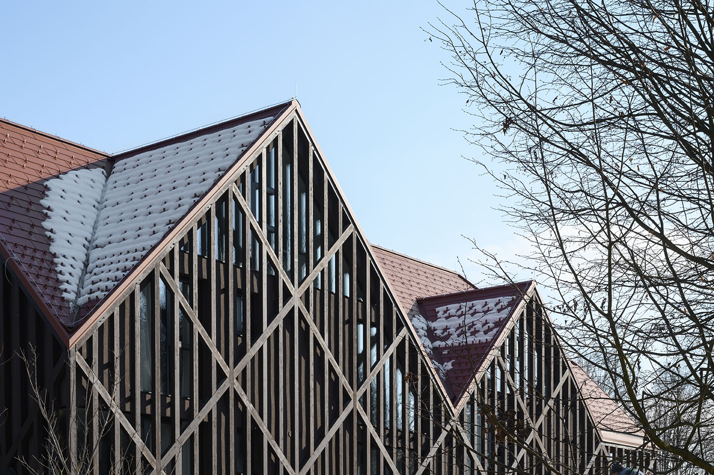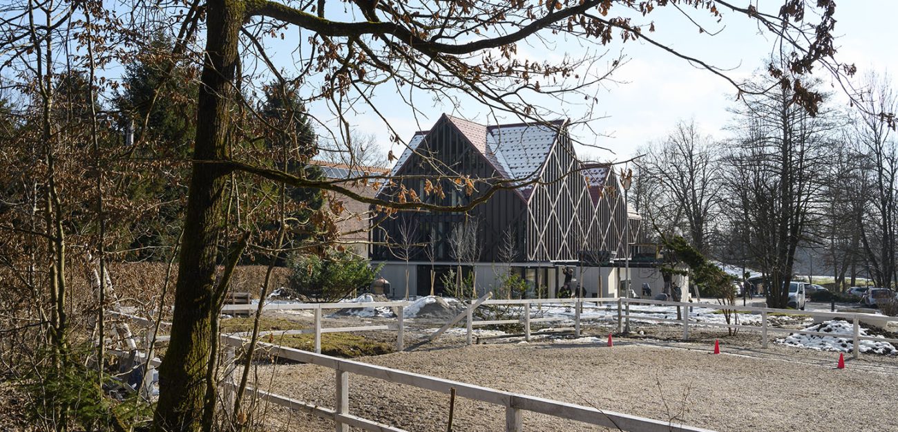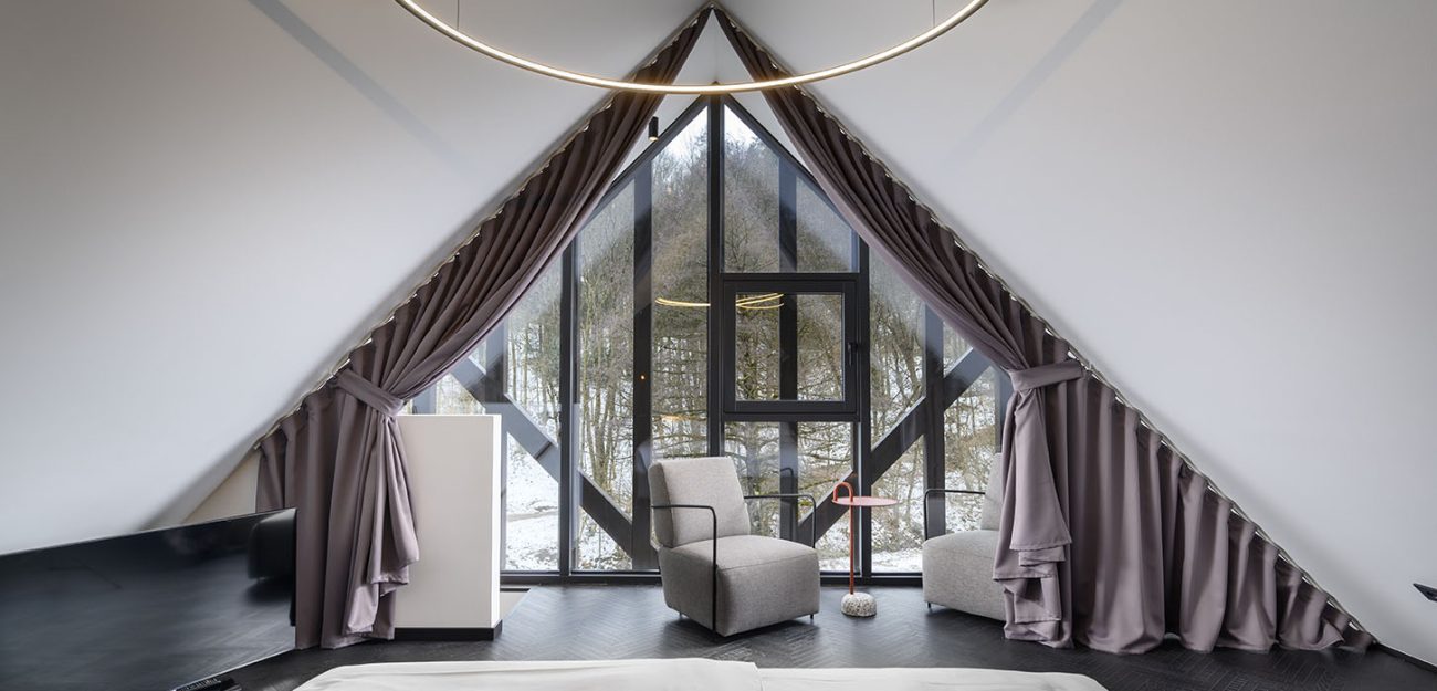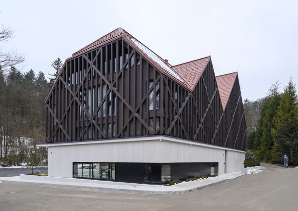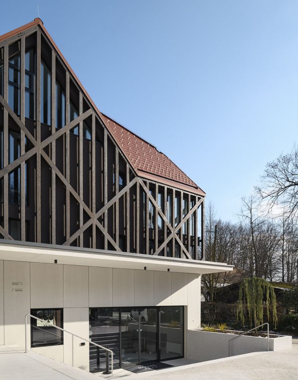 Das Objekt wurde so entworfen, dass der zugelassene Garbarit in größtem Maße ausgenutzt wird. Die Verschiebung der Halbetage und der durchdachte Grundriss ermöglichen die Anordnung von 18 Hotelzimmern, davon 2 Suiten mit Loge und 2 Appartements in der Mansarde. Die Serviceräume sind im Keller, während im Erdgeschoss das öffentliche Programm mit der teilweise inkludierten Rezeption und dem Kaffeehaus im Garten stattfindet. Die Inspiration bei der Erforschung des konzeptionellen Entwurfs der Fassade war eine märchenhafte Verflechtung von Schatten und Sonne sowie sichtbare Holzkonstruktionselemente in Villen im benachbarten Rožna dolina. (Foto: Miran Kambič)