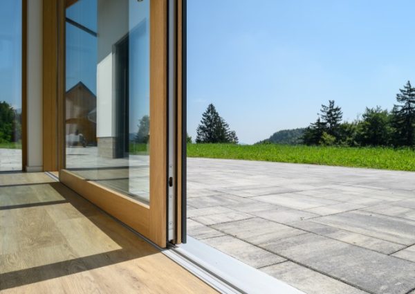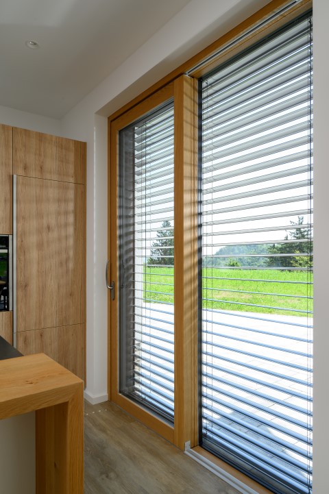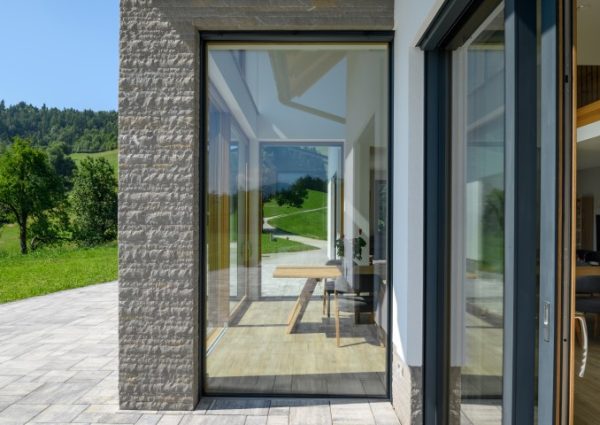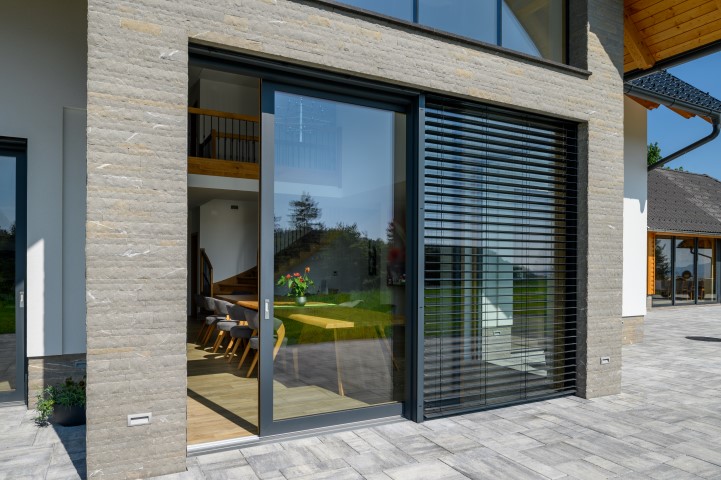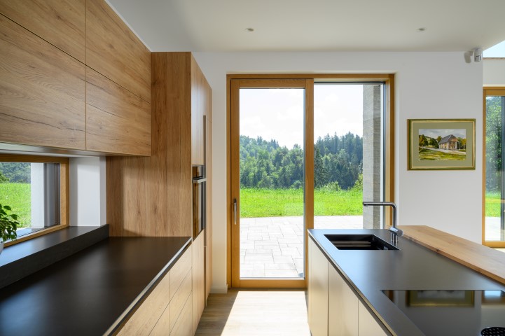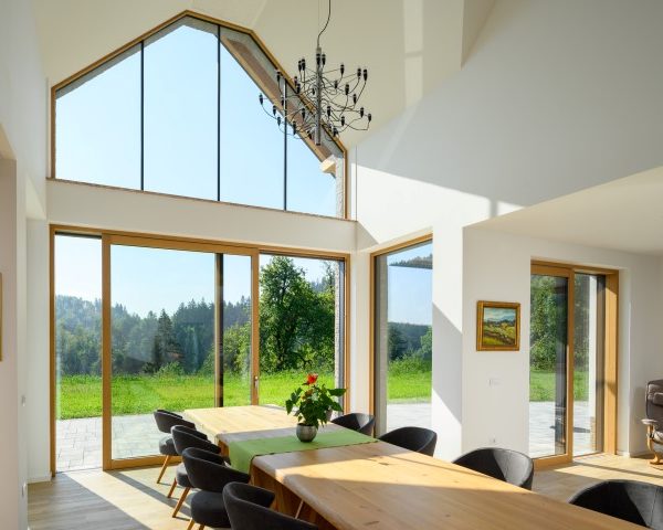 Die Eigentümer wünschten sich auf der einen Seite eine Architektur, die möglichst der Gebäudebautradition in der Umgebung angenähert ist, auf der anderen Seite wünschten sie sich aber eine Öffnung hin zu einem einzigartigen Ausblick auf die Wiesen und Wälder in der Umgebung. Wunderbare Ausblicke entstehen durch die großen Verglasungen und die verschiebbaren Panoramawände. Die Fensterrahmen aus Eichenholz sind im Inneren sichtbar und umrahmen schön die grünen Schattierungen der Natur, an der Außenseite sind sie durch das Aluminium in der Farbe Anthrazit, die sich perfekt mit der ausgewählten Bedachung verbindet, vor witterungsbedingten Einflüssen geschützt. (Foto: Miran Kambič)